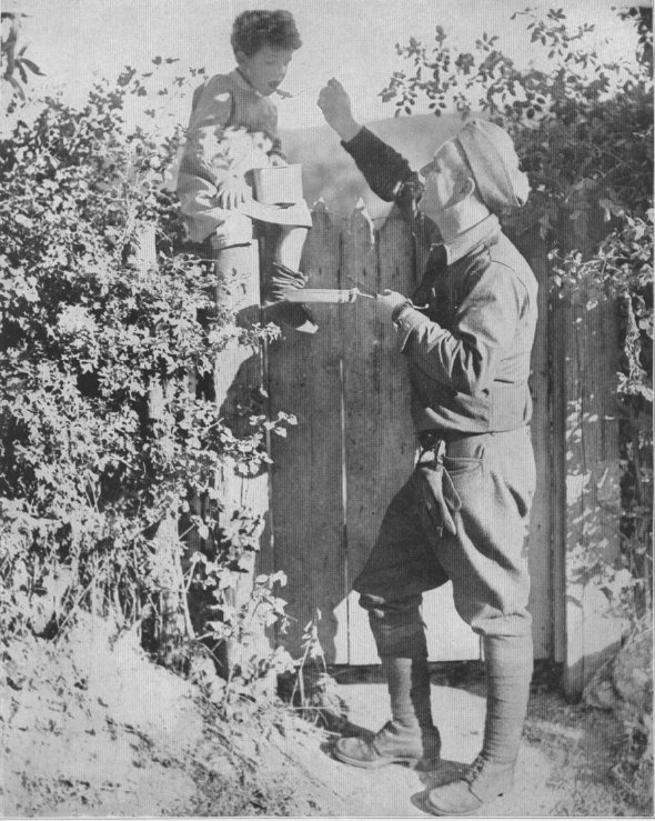 "Fifty-fifty" was the motto adopted by doughboys in France--that is, in their relations with the civil population. The Yank and the French boy are pals, sharing food and playing together and each a teacher of languages.