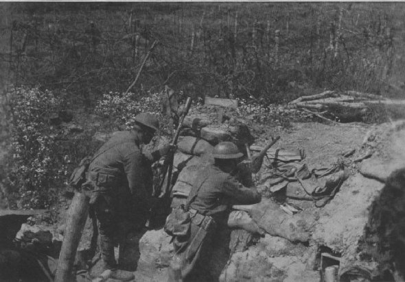 Members of Company A, 126th Infantry, 32nd Division, on duty at outpost. Left to right: Jos. Brust, private, and Garford Wood, private. Hecken Sector, Alsace, June 14, 1918.