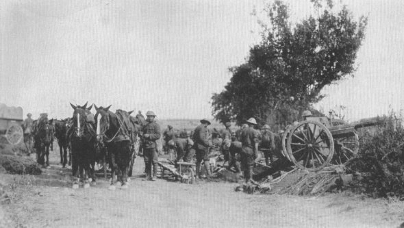 Artillery, 1st Div., changing positions at Soissons. After 3 days of terrific fighting, it was apparent that the great "peace offensive" was collapsing. The Germans advanced only 6 miles, being driven back by the 28th Div.
