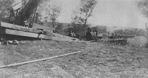 Steam shovel and dump cars of 16th Engineers, on embankment between the canal and the Loire River, Nevers cut-off, Nevers, France. Although often prosaic, the work of the engineers was of utmost importance in winning the war.