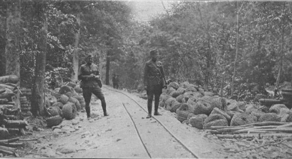 Advance engineer;s dump. Maj. Pugh, 21st Engineers, and Capt. Crofton, Headquarters, Department of Light Railways and Roads, near Nauginsard. An American offensive is in preparation. Barbed wire and other supplies are sent up.