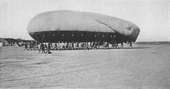Moving kite balloon into open, preparatory to sending it aloft. Artillery fire in World War was mostly "blind," directed at targets out of the gunners' sight. Observers in captive balloons directed the fire by telephone.