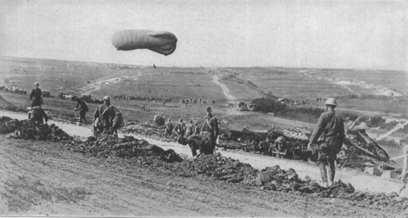 American observation balloon directing fire of French artillery, seen scattered about the fields in background. In foreground, 308th Engs., 83rd Div., are repairing the road between Bethincourt and Cuisy, Meuse, Oct. 5, 1918.