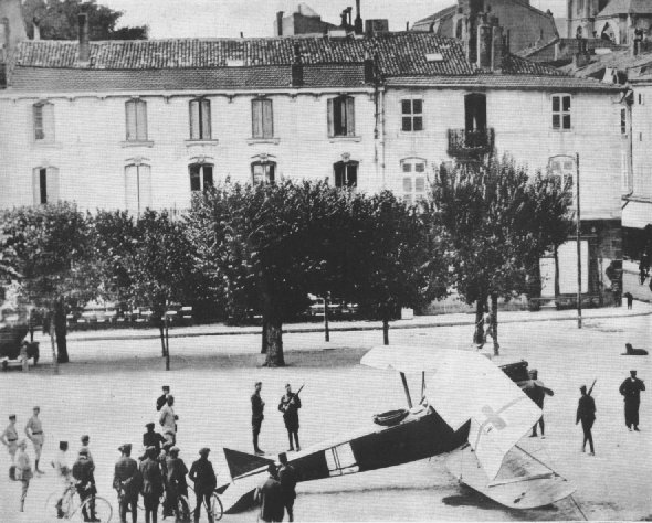 | FALLEN EAGLEGerman observation plane forced down in Toul by Capt. C. J. Biddle, 13th Aero Squadron, Aug. 17, 1918. Observer was shot through stomach and killed; pilot was uninjured. According to official figures, American aviators destroyed 845 enemy planes, 491 confirmed, 354 unconfirmed.