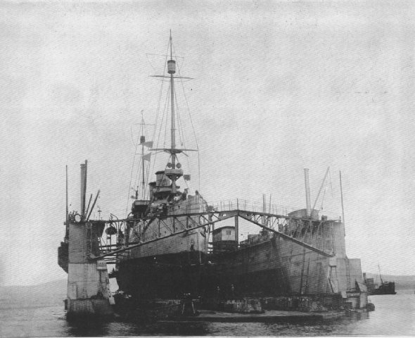 | A HOSPITAL FOR WARSHIPSBow view of a United States ship in a floating dry dock. This mammoth device made it possible to get at the bottom of the largest battleship for overhauling or repairs in short order and without the necessity of a long trip to a permanent base thousands of miles across the water.