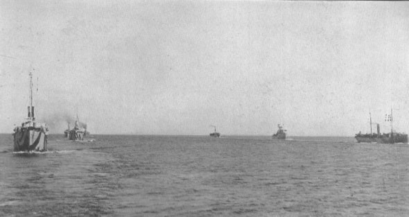 American mine laying fleet in the North Sea. The ships shown are the Canonicus, Canandaigua, Aroostook, Quinebang, Saranac, Roanoke, Housatonic and Baltimore. In the North Sea Mine Barrage, Americans laid 56,611 mines.