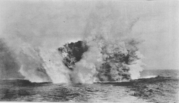 A mine exploding. The completion of the North Sea Mine Barrage was devastating to the morale of German submarine crews, resulting in a mutiny of the crews and the abandonment of the submarine campaign on Oct 26, 1918.