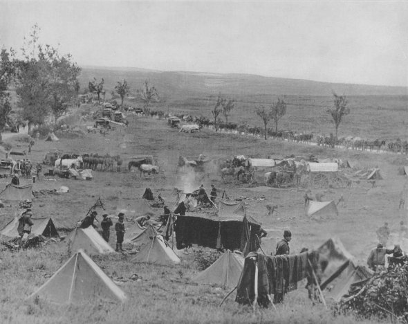 | With a million and a half American soldiers now in France, America, after having been in the war for nearly a year and a half, is finally ready to have an army of its own. Foreground: Brigade, American Field Artillery. The road is choked with artillery equipment assembling. |