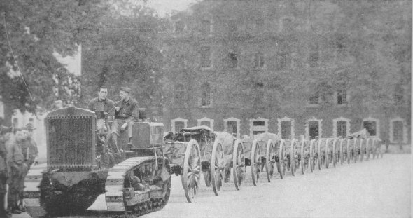 | The most characteristic memory of France at night is the sound of wheels. Nearly all troop and train movements were made after the shades of night had fallen. A ten-ton tractor is shown drawing American artillery caissons. |