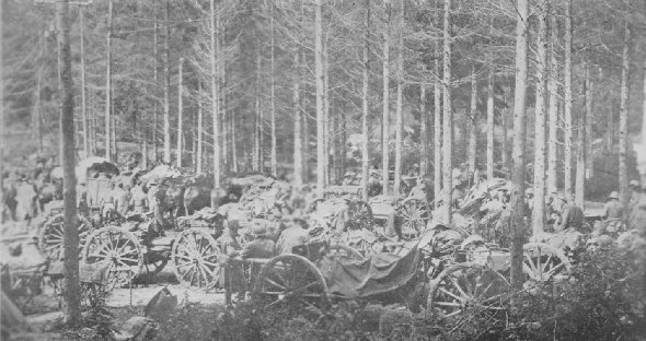 | Battery B, 102nd Field Artillery, 26th Division, Longeaue Farm, France, September 13, 1918, lying in a woods awaiting total darkness. The filth of the litter through all the woods of war-ridden France was unimaginable. |