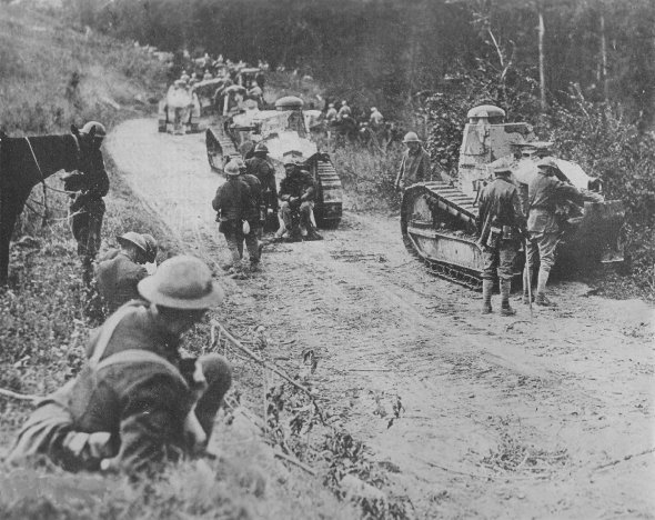 | Tanks, too, are sneaking up for the St. Mihiel offensive. Following the artillery preparation, they will go slightly ahead of the infantry, tearing holes in the barbed wire entanglements. Fortunately this road had escaped severe shelling and the tanks could proceed easily. |