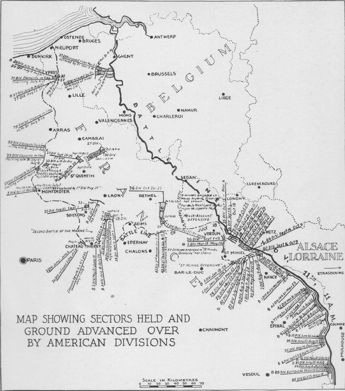 | Cross hatching indicates ground gained by American Divisions, excepting in Meuse-Argonne and St. Mihiel offensives. The jumping off date and date on which they were relieved are shown. For Meuse-Argonne and St. Mihiel offensives it has been found impracticable to properly represent on a map of this scale the ground gained by American Divisions (see separate maps, pages 17, 30, 31, 34, 262, 311, 312, 313). (B) means Brigaded with either the French or British, the combined forces holding the front as indicated. |
