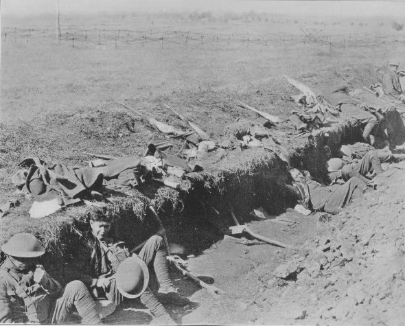| Trenches where the exhausted American soldiers started to dig in on the first night of the St. Mihiel drive. When the work was finished orders came to advance, and they went five kilometers farther. In the center of the picture the village of Beney can be seen in the distance. |
