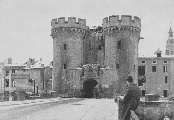 | Porte Chaussee, entrance to the city of Verdun, France. Private E. L. Rose, 4th Corps artist, sketching. |