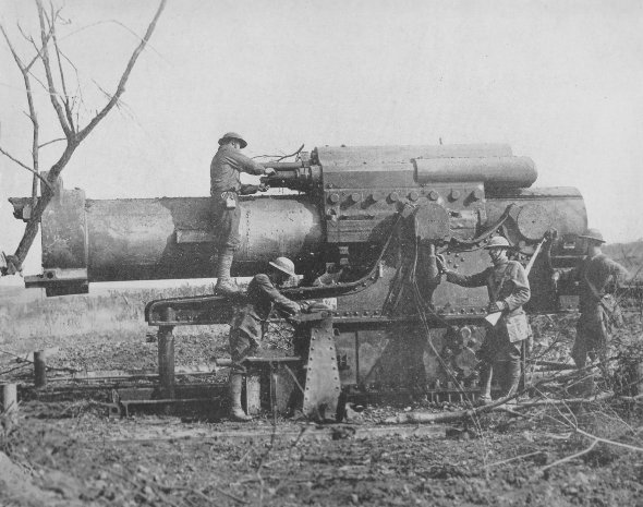 | This enormous 15-inch (38 cm.) gun, left behind by the Germans in their hurried retreat northward from Verdun, was captured by the Americans. The breech lock was damaged beyond repair and the Yanks could make no use of the $70,000 worth of enemy shells that were piled nearby. |