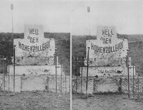 | Some patriotic German erected a monument to the Hohenzollern family at Sassey, France, in the valley of the Meuse, norwest of Verdun. When the town fell into the hands of the Americans a Yankee engineer, much to the amusement of his comrades, slightly revised the inscription. |