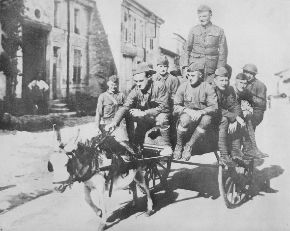 | When a soldier was killed on the field of battle it was said of him that he had "gone west". This happy-go-lucky bunch of Yanks, however, is "going east"all is well with them and they are planning on keeping going in the direction they are headed until they see the Rhine. |