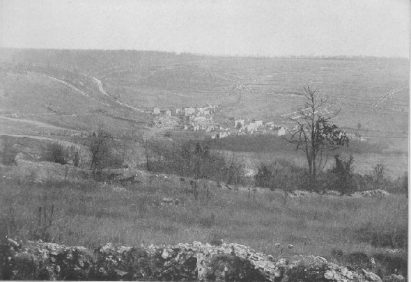 | Front line trench, occupied by the French, on hill back of village, from which Americans started their attack on September 26, 1918. Bouchots Wood, on hill, and German front line back of hill. Vauz-les-Palameix. |