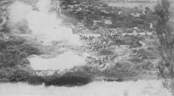 | As the infantry gained ground, the artillery moved up, took new positions and continued to hurl the shells of death and destruction. The town was previously reduced to bare walls and burned timbers by a German bombardment. |