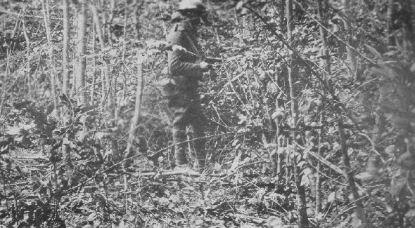 | The rotten woods were filled with dead men, dead horses, with excrement and the garbage of armies. Through this, Sergeant F. A. Hussey, leading the patrol, advances with extreme caution, his automatic always ready. |