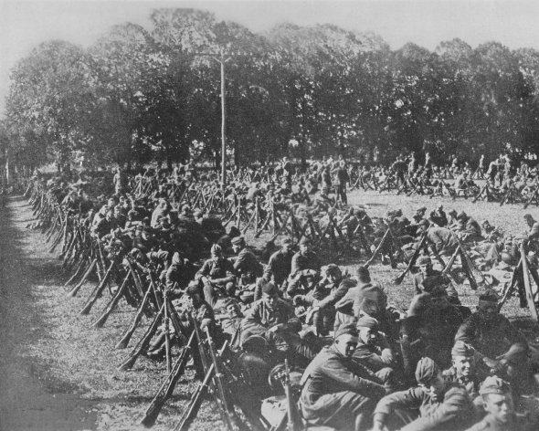 | On Oct. 3, orders were issued to break up the 84th Div. for use as replacements in weakened divisions. This photograph shows Cos. A, B, C, D, E, and F, 335th Inf., near Mussidan, Dordogne, on Oct. 7, with full equipment, waiting for new assignments and orders to join the attack. |