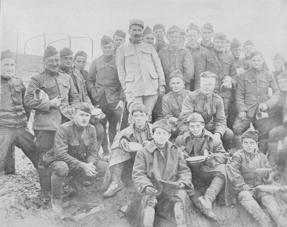 | Four little French boys decided to go to the front with the American soldiers. "Adopted" by the Yankees and given uniforms, they were having the time of their lives until apprehended by French authorities. The Americans shown are members of 3rd Army Corps, Souhesme La Grand, Oct. 18. |