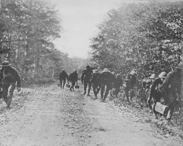 | And they know that some are going up for the last time. But it is part of the job and there is nothing one can do about it. Machine gun platoon, 80th Div., is advancing through the woods between La Chalade and Le Claon, heads lowered to lessen the danger of the threatening attack. |