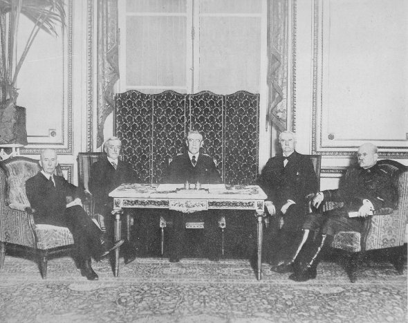 | L to R: Col. E. M. House, Secretary of State Lansing, President Wilson, Henry White, General Tasker H. Bliss. The ordeal of fighting for American idealsfor the rights of humanity against autocracy and dictatorship, broke the health of President Wilson, causing a premature death. |
