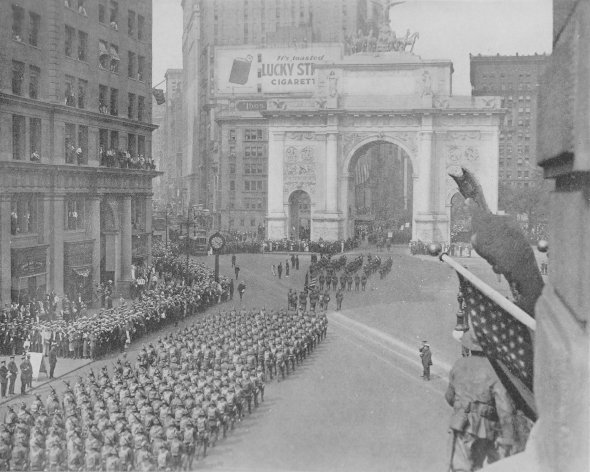 | Back in "the good old U. S. A." and in "Little Old New york," too. The famous Second Division, Marines"the first to fight and the last to return"marching up Fifth Avenue through the Victory Arch at Madison Square in America's greatest city. Now the big problem is to find a job. |