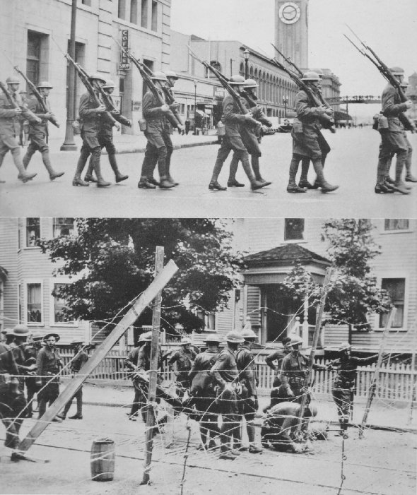 | To maintain law and order, which was beyond the ability of the police, nearly two-thirds of the states were forced to call out the National Guard in 1934, thus adding to the American tax burden. (Above) California National Guard on waterfront, San Francisco, during the general strike. (Below) National Guardsmen erecting barbed wire barricade in street at Saylesville, R. I., to prevent repetition of bloody riots in which a score of pesons had been injured. |