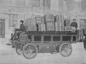 "Now suppose the engine at rest. The forward movement of the piston sucks in the charge of air and vapor; when the piston goes back on its return stroke it compresses that charge between the piston and cylinder head, and just when the charge is at its highest point of compression an electric spark flashes through it and explodes it. The explosion drives the piston forward, and at the same time the gasoline valve is closed, so that on the fourth strokethat is, the next stroke backwardthe exhaust valve opens and the exploded gas leaves the cylinder and goes into the muffler. Then the next forward stroke sucks in a new charge and the same operations are repeated. "This motor here is what is called an air controlled motorthe air is compressed by a pump in and about the inlet valve which feeds the gasoline to the carburetor and the gas-air mixture to the cylinder. A pipe carries the compressed air forward to the person who is running the automobile. A button controls a valve at the forward end of the pipe in such a way that it it is compressed some of the air is released and the pressure is lowered. And this operates to move the valve so as to allow not only more gasoline to pass into the carburetor, but also more of the gas-air mixture to pass from the carburetor to the cylinder. "The electric sparks for igniting the charge in the cylinder are made by a little dynamo which is part of the outfit, but in starting the machine, however, the sparks come from an electric battery. When the machine is idlethat is, when the engine is in operation, but the automobile is standing stillthe fly-wheel of the engine makes about 100 revolutions per minute. On a good road the motor makes about 800 revolutions, going thirty miles an hour. The horse power of this engine, which is the style used on the ordinary runabouts, is eight and a half, and the automobile as it stands weighs 1,850 pounds. In its gasoline tanks it carries about nine gallons of the fluid, which on good roads is good for a tour of from 125 to 140 miles. All parts of the engine are automatically oiled, and the mechanism as it stands there is a beautiful example of fine workmanship." As compared with its competitors, the electric auto is simplicity itself. The driving mechanism is a first-class electric motor; the energy comes from the storage batteries that are carried on the machine. The electric automobile is clean, simple, safe and more expensive than the other styles. Electricity from the battery passes through a controller, which, by making different combinations, of batteries, feeds more or less electricity into the motor, and consequently decreases or increases the speed of the vehicle. For instance, an ordinary electric runabout, at the lowest speed, requires about twenty volts; second speed, forty volts; and third speed, eighty volts; which means that every one of the forty cells of the batteries is at work. An ordinary electric carriage will use from seventeen to thirty amperes per hour. The average radius of the electric vehicle is forty miles per charge, that is, the average electric auto, with one charging of its storage battery, will travel forty miles without requiring recharging. Some will go much farther-others not so far.