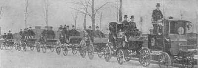 It was with a steam automobile with an engine of this kind that the world's record for steam automobiles was broken, in October, 1902, by making a mile in one minute and twenty-seven and one-fifth seconds. There was a steam pressure of 650 pounds to the square inch in the wire-wound copper boiler of the machine. "The cylinders of the enginethere are two of themare two and a half inches in diameter, the engine has a stroke of three and a half inches and the steam is cut off at five-eighths stroke. The ordinary working steam pressure is 160 pounds. The engine weighs forty-seven pounds and is three and one-half indicated horse power. This is the engine used in the ordinary runabouts which weighs 650 pounds. The boiler is of the fire tube type. It is fourteen inches in diameter and thirteen inches long, and it has 298 copper tubes, each one-half inch in diameter. The copper shell is seamless, with steel heads, and there are about 2,000 feet of steel piano wire wound, in two layers, around the boiler to strengthen the copper shell, which is only three thirty-seconds of an inch thick. The boiler is covered with an asbestos jacket that not only prevents the steel wire from rusting but prevents loss of beat by radiation. The boiler holds about five gallons of water, but carries, when in use, but three gallons. "The water for the boiler is contained in a tank that holds twenty-seven gallons, and it is forced from this tank to the boiler by a pump attached to the cross-head of the engine. As the pump works all the time while the machine is running, it is necessary to provide means to shut off the water from the boiler when none is needed, and this is done by means of a by-pass and an automatic valve that shunt the water back to the tank when necessary. "The furnace of the boiler is a Bunsen burner, for gasoline is the fuel. The burner consists of 200 one-half inch copper tubes expanded between two steel plates. The tubes are for the air which is burned with the gasoline. In the steel plates are about fifty small holes for the gasoline vapor, which is taken in between the two plates through a mixing tube from the gasoline jet valve. The beat of the boiler is used to vaporize the gasoline and make it a gas. The top plate of the burner is four inches in diameter and the whole burner sits down four inches below the bottom of the boiler. "The fire is controlled entirely by the steam pressure, which actuates a copper diaphragm whose expansion or contraction opens and closes the needle valve that feeds the gasoline into the burners; the gasoline is under an air pressure of eighty pounds to the inch, so that it jets out in spurts. The diaphragm is normally set for 180 pounds of steam. When the pressure exceeds that amount the diaphragm moves and operates the valve, which reduces the flow of gasoline and thus lowers the flame under the boiler. If the pressure falls below the working standard the diaphragm moves the other way and more gasoline is fed to the fire. The boiler is provided with a safety valve, which blows off at 260 pounds pressure. Between the boiler and the throttle valve of the engine is a globe valve which can be opened and closed only by a key carried by the operator of the automobile. If it is desired to leave the rig the key shuts this lock valve and no steam can enter the engine's cylinders. "About five gallons of gasoline are carried in the reservoir, and as it takes one gallon to run ten to twelve miles, enough fuel for a sixty-mile run can be carried in the tank. The boiler evaporates about one gallon of water to the mile run. The speed of the machine is controlled by the throttle; the more steam the higher speed. The rear wheels are the drivers, which are driven through., differential or compensating gears. This gearing permits the outer wheel to revolve faster than the inside wheel in going around a curve. The engine drives a sprocket which transmits its motion to the differential gearing by means of a steel link belt, and the engine makes two and one-half revolutions to each turn of the gear. When running ten miles an hour the engine makes 300 revolutions. The brake is a double action band brake. Ball bearings are used on the engine as well as on the wheels, and the tires, of course, are pneumatic. The operator has at hand the steering device, throttle valve, reversing lever and brake lever, and in front of him is a steam gauge and air gauge. "It will be noticed that the steam automobile uses gasoline for fuel and calls in compressed air as an agent to present the fuel to the flame in the best possible manner. In the automobiles operated by gasoline engines, the volatile child of petroleum is the fuel, but it is used without being first burned to raise steam. It is curious that while gasoline, is the operating agency of the gasoline motor, water, electricity and compressed air are also necessary. The water is required to keep the cylinder of the gasoline engine cool; the electricity to make the sparks that explode the gasoline at the proper time, and the compressed air to enable the operator to govern the supply of the fluid and gas. "There is a miniature waterworks system in a gasoline automobile. If it were not for water to cool the cylinder of the engine the piston would stick, and that would end its operation, for the time being at least. The water tank lies up pretty snug to the engine and the water is forced forward through a pipe to the front of the machine, where it passes through the radiator, which might be called the dashboard. It is placed in front so as to get the full effect of the air that rushes through it and cools the water. From the radiator the water passes back and performs its office of cooling the cylinder of the engine. It then passes on and re-enters the reservoir to continue its cycle of operations.
