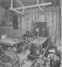 | Interior of experimental station at the foot of Oak Street. | This wave is called the Hertzian. It is generated by a battery, and passing in brilliant sparks between two brass balls, is radiated to space from a wire suspended on a tall pole. By the shutting off and turning of this peculiar current, the waves are so divided as to represent the dots and dashes of the ordinary Morse alphabet of telegraphy. The waves which come from the transmitter are received on a suspended wire elevated either by a mast, kite or balloon. This wire is exactly similar to the one used in the transmitter, but by the time the waves have passed over a long distance, they are so weak that they could not of themselves operate an ordinary telegraph instrument. For the necessity thus arising, Marconi found a remedy in his coherer. This instrument is a little tube of glass, about two inches long, and as large as a small lead pencil, in diameter. The ends are plugged with silver and nearly meet within the tube. In the space between the plugs there is a small quantity of nickel and silver filings, finely powdered.  | MARCONI STATION The Great Wireless Telegraphy Station at Glace Bay, Canada. Towers each 215 feet high, from which Mr. Marconi flashed the first wireless sentences. | The filings are jumbled together like the particles of a sand heap, and in that state they form a very poor conductor. When they receive an electrical wave, however, they cling together as tightly as a solid conducting bridge that carries a current from a local battery to a receiving telegraphic sounder of common pattern. If it is connected at one end with the suspended wire and at the other end with the Morse instrument, there