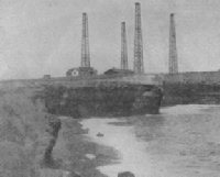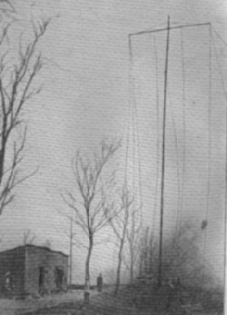 | TEMPORARY EXPERIMENTAL STATION. Showing pole and air wires. | In his early experiments Marconi believed that in order to cover great distances, very high masts must be used - the greater the distance, the taller the mast. He thought the waves were hindered by the curvature of the earth, but his experiments have proven that very tall masts are not necessary.