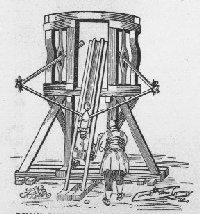 | | Roman Catapult for throwing stones | Two great wars of recent date, the one between the United States and Spain and that between the Boers and Great Britain, have served one purpose, if nothing else, that of showing how terrible can be the destruction of modern inventions of war. The stride made in a century in the development of war vessels, guns, explosives and methods of warfare has been marvelous. No longer do we hear of the frequent hand to hand conflict, of grappling chain and cutlass on war vessels, and the practical use of the bayonet. One would fain believe that with the awful examples set, universal peace, as proposed by the Czar of Russia several years ago, might not be mere illusion.