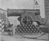 | One of the Napoleon's guns, in the Kremlin, Moscow, Russia | Into a large tank called an "agitator" is stirred a quantity of nitric and sulphuric acids, in equal quantities. The stirring is done by means of automatic, revolving paddles. After there are 25 pounds of the mixture, 1,500 pounds of sweet glycerine are added. At once the mixture rises rapidly in heat. Since it will explode at 90-degrees F, water pipes are provided about the agitator to keep the mixture cool. In carrying the stuff, there is great danger of spilling it, which would at once cause a terrible explosion. The life of the nitroglycerine maker is only about five years at his work. As in the factories of other powders and explosives, great care is taken that no metals are worn. The clothing and shoes of the employes must be changed frequently, so that gritting dust will not accumulate in them. Even canvas shoes must be worn, and the trousers of the working men must not, be turned up for fear gravel might be gathered in them.
