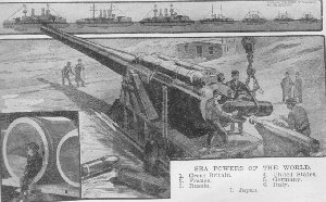 The explosives of high power that serve for force to drive the monster projectiles from the throats of the gigantic cannons of to-day, are numerous and terrific. One of the principal new inventions is lyddite, an explosive of the same class as dynamite, cordite, maxinite, melinite, etc. Lyddite is a mixture of picric brought to a state of dense fusion.. This acid is given off by the action of nitric acid on carbolic acid. When a charge of this potent explosive goes off there is a deafening report, the outer coverings of the lyddite shells are ground into fine pieces and everything for a great distance around it is destroyed. This was used with deadly effect in the Boer, Japanese-Chinese and Soudan wars. During General Kitchener's campaign in the Soudan, a shell was dropped upon a temple of Mahdist worshippers and only twelve out of 120 there escaped alive. Cordite, discharged a twelve-inch shell into the Japanese flagship Matsushina during the Chinese conflict, hurled a large gun from its mounting, fired a quantity of ammunition, disabled two other guns, and killed and wounded ninety officers and men.
