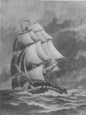 | Typical American warship of early times. US Frigate "Constitution" ("Old Ironsides") built in 1809, reeling off 13½ knots an houra speed greater than that of the racing yachts of today. | The machine gun works deadly havoc either from the crow's nest or fighting top of a ship, or on the battlefield. Among the terrible engines of war those most prominent are the Gatling, Maxim and Hotchkiss guns. The first-named is constructed of a number of barrels joined together side by side so that at a distance the whole contrivance looks like a big, stubby gun. Generally about ten barrels make up one gun, and all revolve upon one central pivot. Each chamber has a separate lock which discharges the cartridge when the barrel reaches its proper position. The affair works by a crank and the cartridges are allowed to slide from a rack down through grooves into their chambers, and are ejected automatically as soon as discharged. About 1,200 shells a minute can be fired from a Gatling. The Maxim is entirely self-acting after the first discharge. The cartridges are loaded into the gun on a belt, and all the gunner has to do is to pull the trigger for the first shot, and keep aim. The recoil is sufficient to open the breech, throw out the empty shells, admit a fresh shell, cock the gun and fire it again. A belt with 600 cartridges, can run through the gun in a minute.