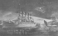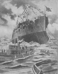 | Launching of the armored cruiser "Colorado". Illustration shows vessel leaving "the ways" at Cramp's shipyard, Philadelphia, April 25, 1903. (Opposite picture represents her completed and cruising at sea.) | Of great use in modern warfare as well as in commercial marine service is the searchlight. Nowadays, nearly every steam-driven vessel is equipped with one or more of the great lights. In war they are serviceable in locating the enemy at night, in detecting the movement of torpedo boats, and in directing vessels by signals. In commerce they aid in signaling, in lighting the path of the vessel, and in rescuing people who fall overboard. They are used in lighthouses, and even fire departments in the great cities use them to light up dark buildings where the firemen must go. Some of these lights throw beams many miles. Generally they are made of lenses and reflectors that will collect and send out the light of a 25,000 candle-power electric arc lamp. They are constructed in cylindrical shape about a yard deep, and nearly of the same diameter. In the back are silver-back reflecting lenses of great power, and powerfu`l reflecting lenses are placed in the focus of the beam of the enclosed electric light. Both of these lenses collect and concentrate the light and throw it far out upon the night. The rays are kept so close together that nearly a mile away the width of the projected beam is only about fifty feet. The whole device is poised on a revolving pedestal and can be moved in any direction desired. One of the largest of these great searchlights was exhibited on the roof of the Manufacturers' Building at the World's Columbian Exposition at Chicago in 1893. It has since been installed in the observatory on the summit of Mount Lowe, California. It has a power of 3,000,000 candles, and throws a brilliant light 150 miles. Its huge reflecting lens weighs 800 pounds. This lens is three-quarters of an inch thick at the edges, and one-sixteenth in the center. The whole light weighs 6,000 pounds, is 11 feet high, and yet so delicately is it poised that a child can direct it at will.