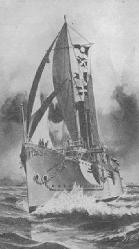 2Only type of New Style Naval Vessel, with sails for motive power. Class of six ships designed for "police protection" to the rapidly extending interests of this country. Vessel is officially termed "an improved model of the 'Raleigh' class of cruisers," which were built when the craze for speed at any price was at its height, and is a "stayer" rather than a "flyer", having coal capacity to steam 12,000 miles. This, with her sail auxilliary power, renders her independent of many coaling stations and fits the ship for longer voyages than is possible with any other type of the new navy. Description Speed, 16½ knots per hour; length, 308 feet; beam, 43 feet; displacement, 3,400 tons; battery, ten 5-inch, eight 6-pounders, two 1-pounders, and two Colt rapid-fire guns. Sail area, 6,000 square feet of canvas.