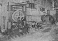 | General view of Arc Machine on left driven by motor at right, receiving its current from Niagara Power Plant. | Science, however, is coming to the rescue. Spurred on by the timely warning of Sir William Crookes, scientists, all over the world are endeavoring to develop artificial means of producing nitrogen in quantities sufficient not only to supply present needs, but to lay up goodly stores for the future. Be it known that there is nitrogen in superabundance in the very atmosphere we breathe. On every square yard of the earth's surface nitrogen is pressing in the form of gas in the air, with a weight of seven tons. The question that is perplexing inventors is that of developing a means of "fixing," or extracting it from the air at a little cost. Chilean nitrate costs $37.50 a ton, while commercial nitric, acid costs $80 a ton. It is with the ceaseless power of Niagara Falls that enough electricity is derived to extract nitrogen from the air so that nitrate of soda ought to be produced at not more than $25 a ton.