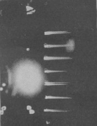 | Eight-inch 10,000-volt arcs burning the air. | The device at last invented consists of a big box of metal six feet high and three feet in diameter. Within this box is a revolving cylinder or hollow shaft. There are openings in the box to admit air and to circulate it, and around its walls are fixed electrical contact points for the arcs, arranged in six rows of 23 points each. The negative pole of a 10,000-volt dynamo circuit is connected with the revolving hollow cylinder, which has contact projections or fingers to touch the other contact points.