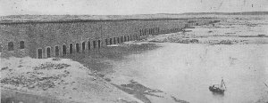 The first channel was successfully closed on May 17, 1899, the depth being about 30 feet and the velocity of the current about 1.5 miles an hour. In the case of another channel, the closing had to be helped by tipping in railway wagons themselves, loaded with heavy stones and bound together with wire ropes, making a weight of about 50 tonsthis great mass being necessary to resist displacement by the torrent. These rubble dams were well tested when the high Nile ran over them; and on work being resumed in November, after the fall of the river, water-tight sand-bag dams, or "sudds," were made around the site of the dam foundation in the still waters above the rubble dams, and pumps were fixed to lay dry the bed of the river.