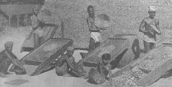 The graphite is taken in the lump from the mines and carried to the reducing mill, where it is ground or pulverized in stamp mills under water. The fine particles of graphite float away with the water through a number of tanks, collecting at the bottom of these reservoirs. It is packed in barrels in the form of dust and sent to the factory, where tens of thousands of lead pencils are turned out every day. The pulverized graphite is so fine that it really is dust; it is dingy in color, and smooth and oily to the touch. It is divided into various grades of fineness by floating it on water from one tank to another. The coarse dust sinks to the bottom of the first tank, the next finer, to the bottom of the next and so on down the line, the finest powder, for the finest pencils, settling in the last tank. In another series of tanks the German pipe clay, which is mixed with graphite to secure the different grades of hardness, is graded in the same manner by floating. The finest clay is mixed with the finest graphite, and the hardness of the pencil is secured by increasing the proportion of clay in the mixture. For medium grades seven parts, by weight, of clay are mixed with ten parts of graphite. The mixing is done under a grinding mill similar to that used in mixing paint, and water is added to facilitate the mixing. The grinding stones are about two feet in diameter and only the upper one revolves. After the graphite and clay are ground together the mixture is put into canvas bags and the water is squeezed out under hydraulic press, leaving the mass the consistency of putty. This plastic material is placed in the forming press, which is a small iron cylinder in which a solid plunger or piston works up and down. A steel plate having a hole the size and shape of the "lead", is put under the open end of the cullender, and the plunger, pressing down, forces the graphite through the hole, making a continuous thread or wire of graphite. As long as this thread is moist it is pliable, but it becomes brittle when dry, so it is handled rapidly. It is cut in three-lead lengths, straightened out, and then hardened in a crucible over a coal fire. The leads when taken from the crucible are ready for the wood. Pine is used for cheap pencils, an ordinary quality of red cedar is used for better pencils, and nothing but Florida Key cedar is used in the best. The sawmills at Tampa, Florida, cut the cedar blocks about seven inches long and these are sawed into strips wide enough for six pencils; but as pencils are made in halves, each strip is thick enough only for a half pencil. When these strips are received in the factory they are run through a machine which cuts in each one six grooves, round or square, and at the same time smooths the face of the wood. The filling of the strips is done by girls. The first one takes a grooved strip of wood in her left hand and a bunch of leads in her right. She spreads the leads out fan shape, and with one motion fills the six grooves with leads. Next to her sits another girl who takes the filled strip, and quickly and neatly lays on it another grooved strip, which has just been given a coat of glue by a third girl. The filled and glued strips are piled up and put in a press to dry. The ends of the strips are evened off under a sandpaper wheel, and then the strips are fed into a machine which cuts out the individual pencils, shapes them and delivers them smooth and ready for the color polish in six streams. The coloring is done in liquid dyes, after the pencils have been sent through the varnish machine. Then follows the stamping , finishing and counting. This latter work is done by quickly filling a board having 144 holes in it, thus counting out a gross of pencils. ARTIFICIAL ICE |