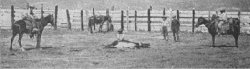 | by courtesy of the Detroit Photographic Co. Branding a steer. | Mr. Forsha has the largest field of alfalfa in the United States, 1,500 acres in one tract. He generally cuts three crops from this field. He grinds the wheat from his own fields into flour, shipping the flour all over the United States. He also buys wheat from adjacent farms and makes that into flour also. A daily weather record is kept on the ranch for the government. The owner's house is heated by steam and lighted by gas.
