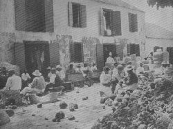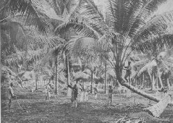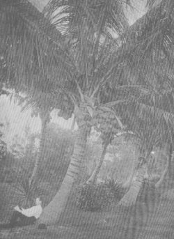 | Cocoanut plantation. Cocoanut raising, so profitable in India, as shown by the above illustration, is also one of the industries of Southern Florida. | On one side is Lake Worth, on the other the Atlantic, and over the stretch of sand between are groves of cocoanut palm and palmettos, avenues of Australian pine and oleanders, and gardens of glorious hued flowers. When all this tropical foliage is bathed in Florida sunshine, gleaming and glad; when the Neapolitan Orchestra goes out under the palms and the guests gather for the afternoon concert, and that heavenly music floats out upon the breezes which come in fresh and sweet from the sea; when the cocoanuts cling close to the strong stems above and great plumes of green sway across the blue beyond, their grateful shade sheltering the throngs of beautifully gowned women below, whose toilets are in pretty pink and purple of the flowers; the scene is certainly very fairylike. It has been called "Paradise" so often that the term is trite. But one could weave many a vision of fancy together and find them realized here.