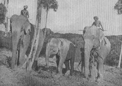 | | Elephant hunting or Kraalling in Ceylon.1 | The use of a sledge hammer to drive a tack would appear scarcely more incongruous than the occasional practice of the Hindoo husbandman of having an elephant draw his plow. The employment of this powerful and sagacious animal in important work where heavy lifting is required, does not seem to detract from his dignity; but plowing appears a petty task for so noble a beast. That he does his duty, here as elsewhere, when well trained, need not be asserted. Neither stump nor stone in the way of the plowshare could stop him, although the implement itself might give way.