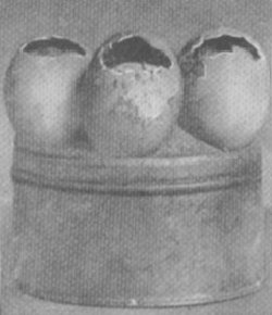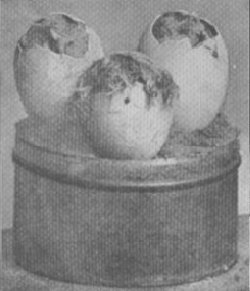 The methods of heating have heretofore mainly been by warm air from a lamp, and by a tank of lamp-heated water. The eggs are carefully sorted, those laid in the latter part of the laying period being left out on account of their deficient vitality. Ordinary incubators have a capacity for 600 eggs each, but some have been made which hatch thousands at once. The heat generated varies from 102 to 104 degrees. Under the hen, the heat is rarely as much as 100 degrees until the ninth or tenth day; her temperature is from 106 to 110 degrees, but that of the eggs seldom exceeds 103°. In order that the temperature of the eggs may reach 102°, the air in the incubator immediately over them is kept about 103° until the first half of the hatching term is reached. Then it is allowed to decrease gradually. The large end of the eggs, which contains the germ is placed uppermost, and during the process the position of the eggs is ordinarily changed, and they are also turned twice a day. The period of artificial incubation is 22 days.