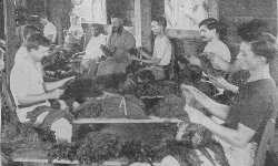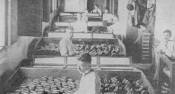 The manufacture of cigars in the United States began in a small way in 1801; the first factory was built nine years later. Before the civil war this country produced less than 200,000,000 cigars; in 1875, 2,000,000,000; in 1892, 4,500,000,000. In America machinery is used for manufacturing cigars wherever possible, and the molds for shaping them are made of hard wood, sometimes partially lined with tin, and of every conceivable size and form. Cigars are composed of three parts, the cone, or filler, the binder and the wrapper. All of the very best cigars are probably made by hand. The maker rolls together, somewhat loosely, pieces of leaf placed longitudinally, and on this he places the binder, around which he carefully winds the wrapper. The only tools used by the cigarmaker are a short-bladed sharp knife, a vessel containing an emulsion of gum, and a square wooden disk, or cutting board. The maker, after molding his bunch of fillers inside the binder, shapes a portion of perfect leaf to form the wrapper. When he has rolled this around the binder he deftly trims the thick end with his knife, secures the taper end by gumming and the cigar is ready for sorting and packing.