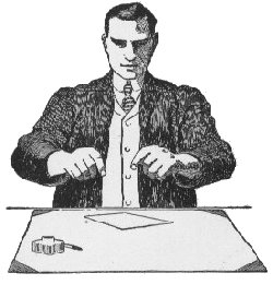 The purpose of illustrations 1 and 2 is to show the natural positions of the fingers that should be maintained in writing. Throw your arms on the desk in a natural position, such as you would take if you were simply resting and not contemplating using a pen; turn the palms of the hands upward, as shown in cut 1, and study the position of the fingers. Now turn the palms downward and raise both arms from the table, as shown in cut 2, the left hand being a little in advance of the right; drop both arms to the table and you will be in a good writing position. But let us go further. Study closely the position of the right hand in illustration 3. Note the fact that the fingers have not been changed from numbers I and 2 beyond what was necessary to hold the penholder firmly. The penholder rests against the side of the second finger, at the root of the nail; the first finger rests on the upper part of the holder, and the thumb rests against the side of the holder at the lower joint of the first finger. Notice further the relative position of every part of the holder with the hand. Now pass on to illustration 4. Here we have a good position for executing writing rapidly and easily on the regular slant. The right arm is thrown well out from the side and a right angle (turn) is formed at the elbow; the third and fourth fingers are thrown well under the hand, forming a movable rest; the side of the hand and wrist, while near the paper, does not touch it; the penholder points a little to the right of the right shoulder; the left hand is at the upper left corner of the paper, keeping it in position; the body, while bending slightly at the hips, is self-supporting, and the large muscles of the forearm rest on the desk, the fulcrum or main rest being just forward of the elbow. Before going any further, experiment with position. Move the hand forward and backward, right and left, round and round, without extending or contracting the fingers holding the pen, and with the pen raised from the paper.